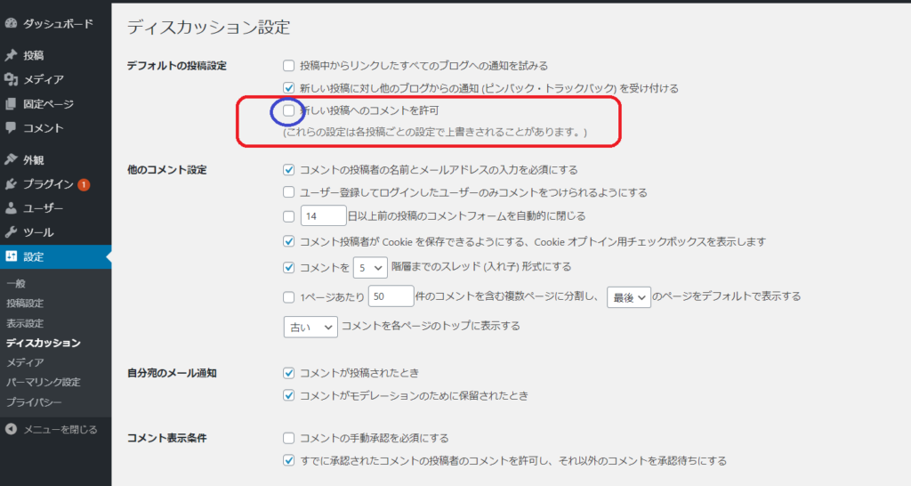 ①「新しい投稿へのコメントを許可」にチェック