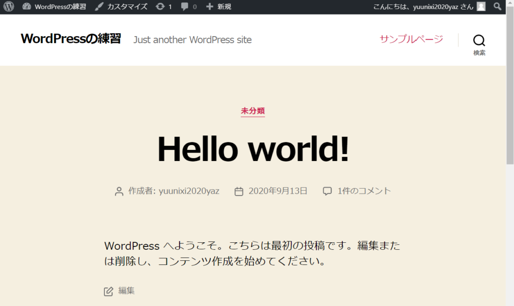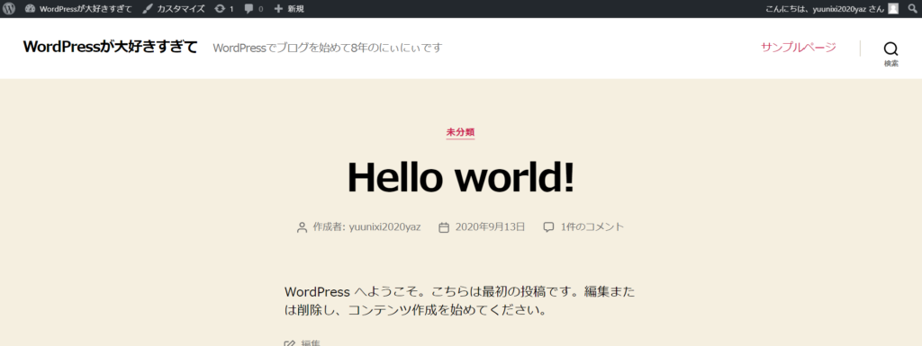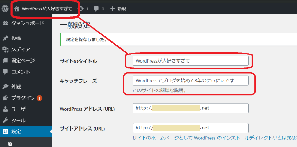 サイトのタイトルを「WordPressの練習」から「WordPressが大好きすぎて」、キャッチフレーズを「Just~~」から「WordPressでブログを始めて8年の~~~」に変更しました。