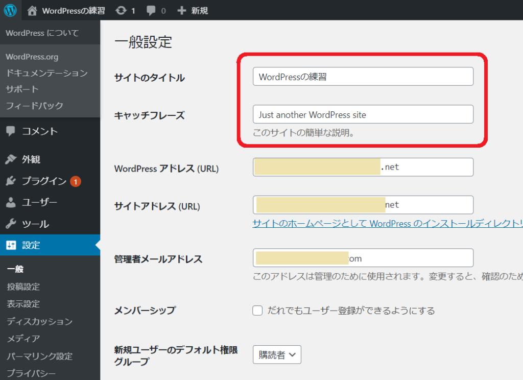 一般設定では、ワードプレスで作ったサイトの上の方に表示されるタイトルやキャッチフレーズを設定できます。