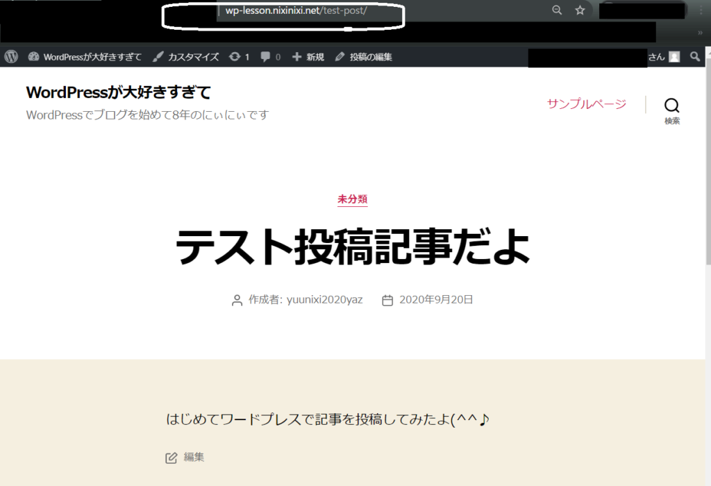 「http://wp-lesson/nixinixi.net/test-post/」と表示されました。
