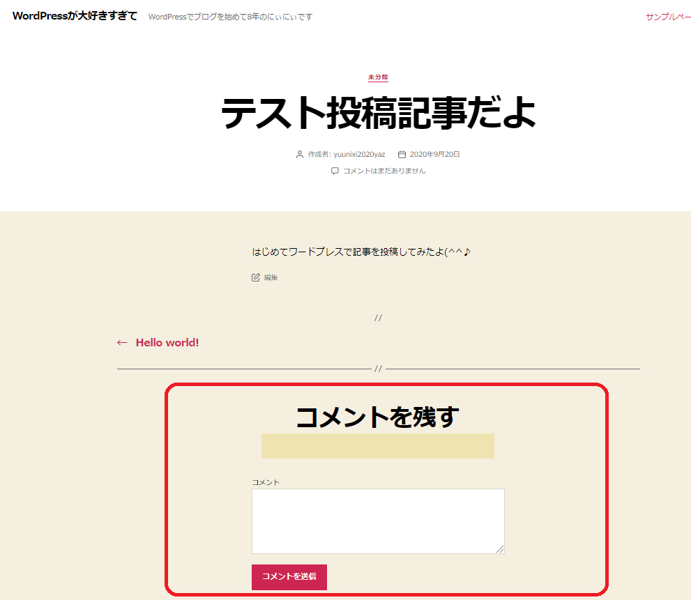 下記画像はテスト記事を書いてUPした画像なのですが、WordPressは初期設定のまま使用すると、投稿した記事の一番下にコメントを入力できる欄が表示されます。