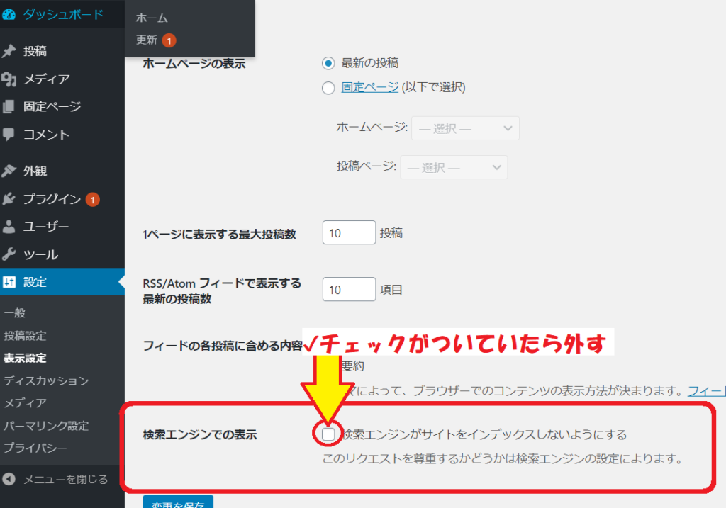この設定の意味を理解するにはSEO(検索エンジン最適化)の知識が必要になりますので、この記事では詳細な説明は割愛しますが、要は、ここにチェックが入ったままで記事を書いてインターネット上に公開しても、あなたの書いた記事は検索されても、ヒットしないよ。みたいな設定になります。